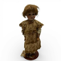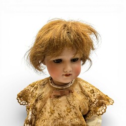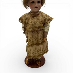 | Omschrijving | Een antieke pop met een porseleinen hoofd en met open mond. Met papiermaché benen en handen. Gekleed. Gemerkt met een nummer 390 en A7M voor Armand Marseille. Ca 1900.. |
