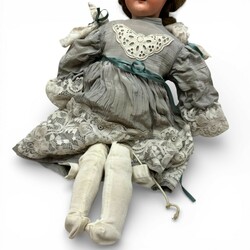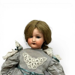 | Omschrijving | Een antieke pop met een porseleinen hoofd en met open mond. Met papiermaché benen en handen. Gekleed. Gmerkt met 250.4/0 voor Heubach koppelsdorf, ca 1914 |