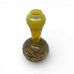 | Omschrijving | Bernard Heesen (1958), geel-bruin glazen vaas, de buik met slingers gedecoreerd in metallicglazuur en met iriserende schittering, onderop gesigneerd en gedateerd '97 |