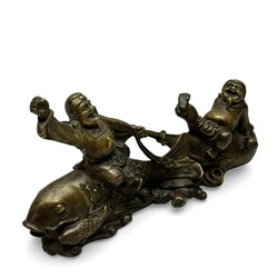 | Omschrijving | Chinees gepatineerd bronzen vormstuk. Twee onsterfelijken rustend op een karper en kanpzak en schildpad. Vol met Chinese symboliek. Vroeg 20e eeuws. |