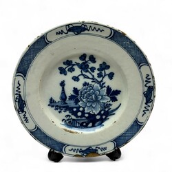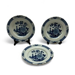 | Omschrijving | Lot van drie antieke 18e eeuwse Delfts aardewerken borden. Chinoiserie decor, met geometrisch motief op de randen, tevens met kostbaarheden in medaillons, op het plat met een voorstelling van bloemen op rotsen en een vaas. Aan de achterzijde gemerkt ‘AP’ = Anthonij Pennis, de Twee Scheepjes 1750-1782) |