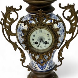 | Omschrijving | Een antieke 19e eeuwse driedelig Frans of Belgisch pendulestel, bestaande uit pendule en twee siervazen. Ca. 1880. Aardewerk aan de onderzijde gemerkt ‘.. Fils Bruxelles’. Met slinger. |