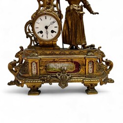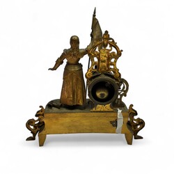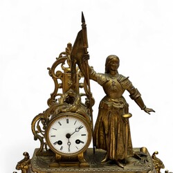| Omschrijving | Een antieke 19e eeuwse Franse pendule in rijk gedecoreerde vergulde kast, met één grote en twee kleinere beschilderde porseleinen plaquettes. De klok wordt bekroond door een beeld van Jeanne d’Arc in harnas, met lans en vaandel in de hand. |