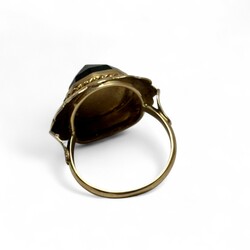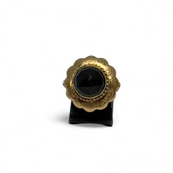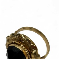| Omschrijving | Een 20e eeuwse 14 karaats (585/1000) geelgouden damesring, met gegraveerde, gesculpte rand, bezet met ronde gefacetteerde granaat. |