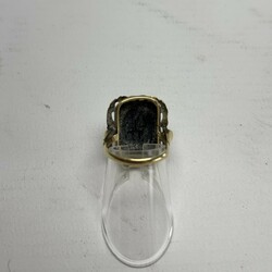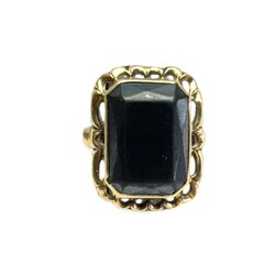 | Omschrijving | Een 20e eeuwse 14 karaats (585/1000) geelgouden damesring, bezet met grote geslepen hematiet. Gemerkt met eikenblaadje en meesterteken ‘WB14’ aan de binnenzijde. |