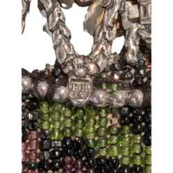 | Omschrijving | Kralentasje met opengewerkte 2e gehalte zilver beugel gedecoreerd met mascarons en vazen, meester F. De Groot Boersma, Sneek, meesterteken gebruikt in 1923 |