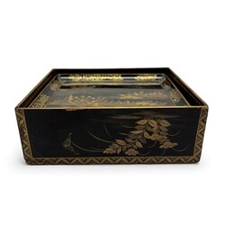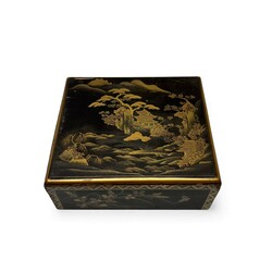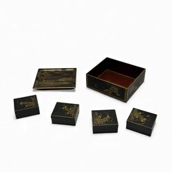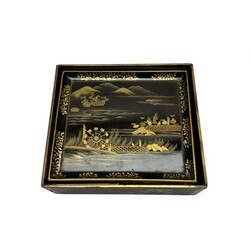 | Omschrijving | Een antieke 19e eeuwse Japans lakwerken doos, Meiji periode (1868-1912). Met dienblaadje en vijf kleinere doosjes, gevuld met parelmoeren fiches in de vorm van o.a. vissen. |