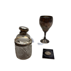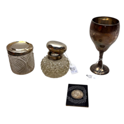 | Omschrijving | Lot divers, waaronder kristal met zilveren deksel en een eerste gehalte (925/1000) zilveren beker. |