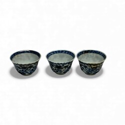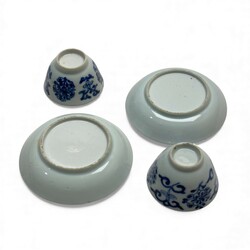 | Omschrijving | Vijf vroeg 18e eeuws Chinees porseleinen koppen, waaronder drie miniatuur kopjes en twee bijpassend schoteltjes. Blauw/wit met peterselie en bloesem decors. Drie miniatuur kopjes gemerkt op onderzijde. KangXi periode. |