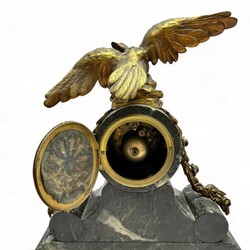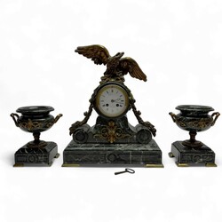 | Omschrijving | Een antieke marmeren pendule, laat 19e eeuws met twee sierurnen. Met verguld bronzen ornamentiek, pendule bekroond met een bronzen roofvogel. Wijzerplaat gemerkt ‘A.D. Ove….’, vermoedelijk A.D. Overstrijd, Rotterdam. |