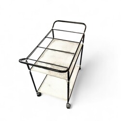 | Omschrijving | Een jaren '80 geperforeerd metalen serveertafel, zwart-wit. Ontwerp Niels Gammelgaard voor Ikea, ca. 1980. |