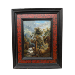 | Omschrijving | Een schilderij olieverf op paneel. Romantische school. Landschap met waterval, hooiwagen en twee figuren. In een faux schildpad en ebbenhouten lijst. |