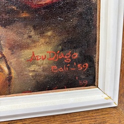 | Omschrijving | Schilderij, olieverf op doek. Voorstelling van een hanengevecht. Linksonder gesigneerd Sochieb (Java 1931). Tevens met opschrift 'Adu Djaga Bali 59'. |