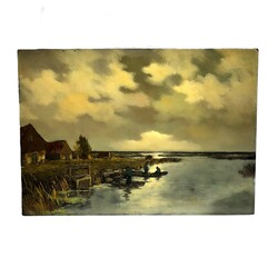 | Omschrijving | Schilderij, olieverf op paneel. Polderlandschap met vissers in een roeibootje. Rechtsonder gesigneerd Toon Koster (Schiedam 1913 - Utrecht 1989). Zonder lijst. |