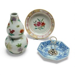 | Kavel | 1454. Twee 18e eeuws Chinees porseleinen schoteltjes en een 20e eeuws kalabas vormig vaasje. |