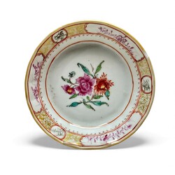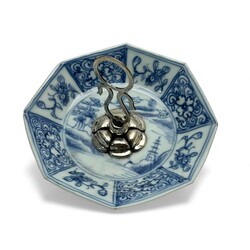 | Omschrijving | Twee 18e eeuws Chinees porseleinen schoteltjes. Famille rose en blauw/wit met een 2e gehalte (835/1000) zilveren applicatie. Hierbij een 20e eeuws kalabas vormig Chinees porseleinen vaasje met polychrrom floraal decor. Gemerkt met rood zegelmerk. |