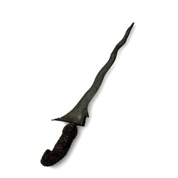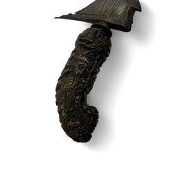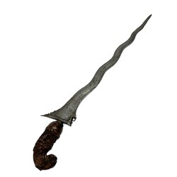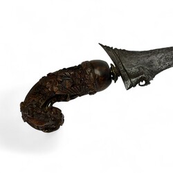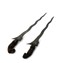 | Omschrijving | Twee Indonesische krissen, beide met rijk gestoken houten greep met florale motieven, vermoedelijk vervaardigd in Madoera, circa 1900 |
