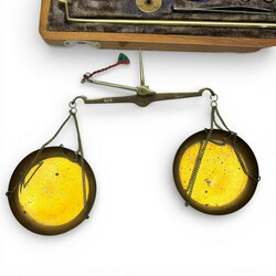 | Kavel | 1683. Weegschaaltje met gewichtjes in houten kistje |