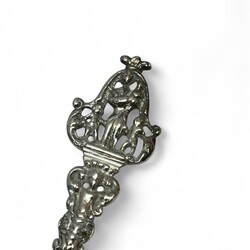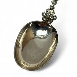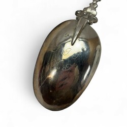 | Omschrijving | Een antieke 18e eeuwse Fries zilveren geboortelepel met getorste steel, bekroond met De Liefde (vrouw met drie kinderen). Aan de achterzijde van de bak met inscriptie ‘S.J.S.’, ‘M.J.’ en meesterteken Ate Scheverstein, werkzaam te Leeuwarden tussen 1720 en 1773. |