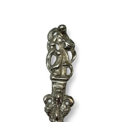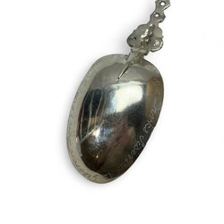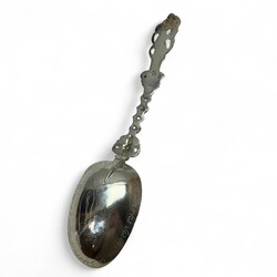| Omschrijving | Een antieke 18e eeuwse Fries zilveren geboortelepel met getorste steel, bekroond met De Hoop. Op de achterzijde van de bak met inscriptie ‘Boukje Dirks Siderius is geboren den 26 september 1805’. betreft waarschijnlijk Baukje Dirks Siderius (Sint Annaparochie 1805-1827). Zonder meesterteken, met belastingkeuren ‘V’ en ‘O’. |
