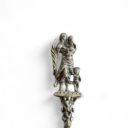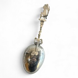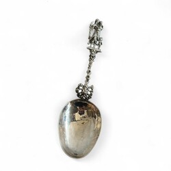 | Omschrijving | Een antieke 19e eeuwse tweede gehalte (835/1000) zilveren geboortelepel, getorste steel, bekroond met Charitas (vrouw met twee kinderen). Op de achterzijde met gravering van een familiewapen, stippelgravure ‘R.A.K’ en tekst ‘Rinke Alberts Koopmans Geboren den 25 Juny 1842’. Onduidelijk gekeurd. |