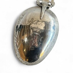 | Kavel | 1922. 19e eeuwse geboortelepel met gegraveerd familiewapen en datering 1842 |