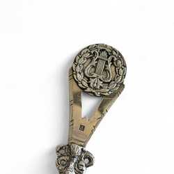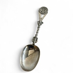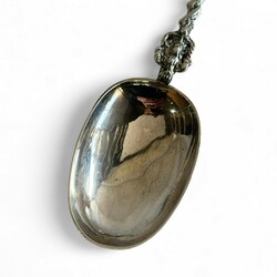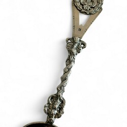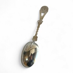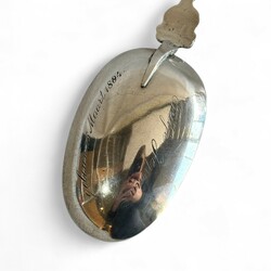 | Omschrijving | Een antieke 19e eeuwse tweede gehalte (835/1000) zilveren geboortelepel, getorste steel, bekroond met een medaillon met warp in laurierkrans. Met inscriptie op achterzijde bak ‘Tettje Jepma geboren 25 maart 1894’ , en een oudere stippelgravure ‘Tettje Taekes Hellinga geboren den 15 april 1841’. Meesterteken ‘T64’ = Egbertus Laurentius Tulleners, werkzaam te Leeuwarden van 1859 tot 1900, jaarletter F (1865). |