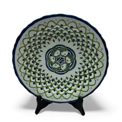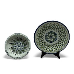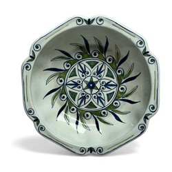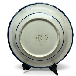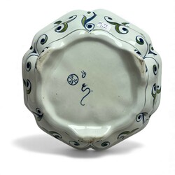 | Omschrijving | Een aardewerken kom en schotel. Blauw/groen en wit geometrische decors. Gemerkt aan de onderzijde. DPC en schilders monogram CU. Fabrikant onbekend. |