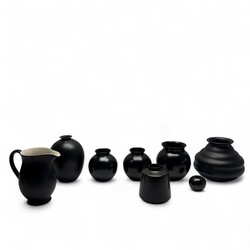 | Omschrijving | Acht zwart geglazuurde platelen vazen en een oorkan. Diverse fabrikanten oa Schoonhoven, Zentith. |