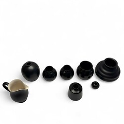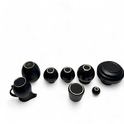 | Kavel | 2047. Acht zwart geglazuurde platelen vazen en een oorkan. |