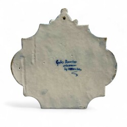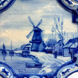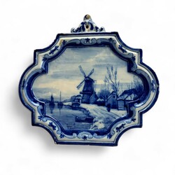 | Omschrijving | Een antieke blauw-wit gedecoreerde aardewerken plaquette. Gecontourneerde rand, centraal landschapsdecor met o.a. een molen, naar Louis Apol. Op de achterzijde tekst 'Gebrs. Ravesteijn Westraven by Utrecht'. |