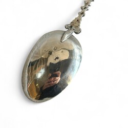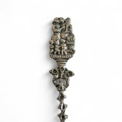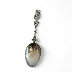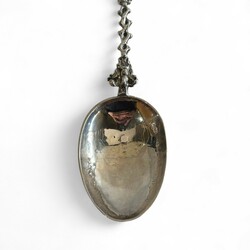 | Omschrijving | Een antieke vroeg 19e eeuwse tweede gehalte (835/1000) zilveren geboortelepel, getorste steel, bekroond met de Liefde (?). Verso met meesterteken IR = Jan Rienstra, werkzaam te Sneek vanaf 1771, datering 1828 en gravering ‘Renske Jans Zonneveld geboren 16 juny 1879 |