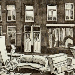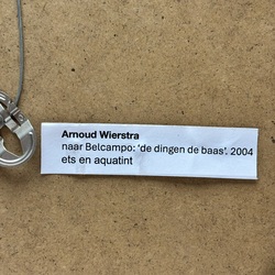 | Omschrijving | Ets en aquatint op papier, titel 'naar Belcampo: de dingen de baas'. Middenonder gesigneerd Arnoud Wierstra (Tiel, 1968), gedateerd 2004, oplage 1/10. |