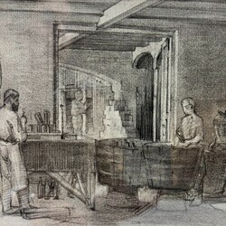 | Omschrijving | Potloodtekening op papier, voorstelling van een kuiperij. Linksonder met atelierstempel Dirk de Vries Lam (Leeuwarden 1869 – Groningen 1937). |