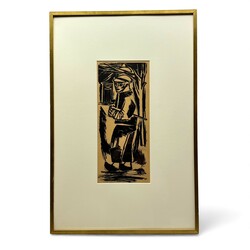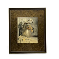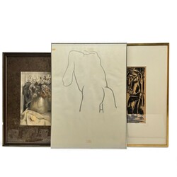 | Omschrijving | Doos met drie kunstwerken, bestaande uit een houtsnede, potlood tekening van een naakt en een prent, bloemstilleven van Dievenbach |