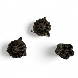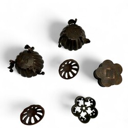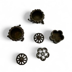 | Omschrijving | Drie bronzen of messing dekseldoosjes, o.a. twee op voetjes met geperforeerd deksel en een klaverblad-model houder. Oosterse stijl. |