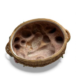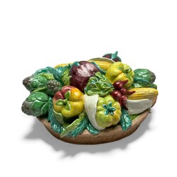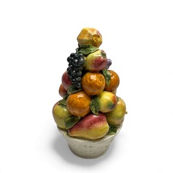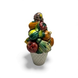 | Omschrijving | Lot van drie 20e eeuwse Italiaanse polychrome tafelstukken, in de vorm van manden, gevuld met fruit. Kleinste exemplaar gemerkt ‘Italy’. |