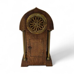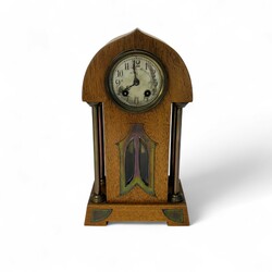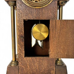 | Omschrijving | Een driedelige jaren ‘20 of ‘30 art deco pendule, eikenhouten kast met messing ornamentiek. |