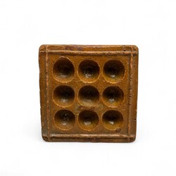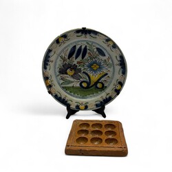 | Omschrijving | Een 18e eeuwse Delfts aardewerken schotel, polychroom met floraal motief. Hierbij een terracotta vierkante kuikendrinkbak. |
