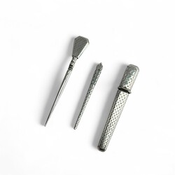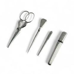 | Omschrijving | Een antiek zilveren naaisetie, gegraveerd, bestaande uit priem, naald, schaar en naaldenkoker. Gemerkt CC en met zwaardje |