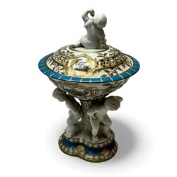 | Omschrijving | Een lot met aardewerk en porselein. Bestaander uit een potpourie pot met deksel, Zes sculpturen, twee porseleyne fles cloisoné tegels en een gipsen kopie van Egyptisch relief. |