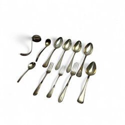 | Omschrijving | Een lot met 2e en 3e gehalte (800/1000 en 835/1000) zilveren schepwerk, bestaande uit lepels, vorken, roomlepels, jamlepel etc. Hierbij een 18e eeuwse vork. |