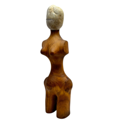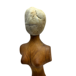 | Omschrijving | Een teakhouten vrouwlijke sculptuur met een uit steen gestoken hoofd. Niet gesigneerd. |