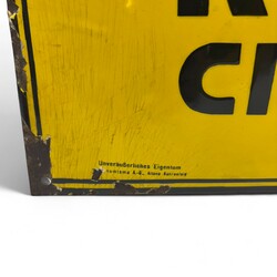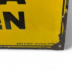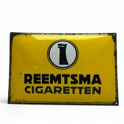 | Omschrijving | Een vroeg 20e eeuws geel-zwart emaille bord met tekst ‘Reemtsma Cigaretten’. Aan de onderzijde met tekst ‘Unveräussigerliches Eigentum’ en ‘Boos & Hahn’. |
