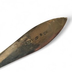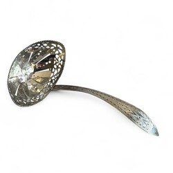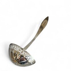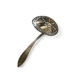 | Omschrijving | Een antieke vroeg 19e eeuwse tweede gehalte (835/1000) zilveren strooilepel met ajour gezaagde bak en gegraveerd steel. Gekeurd ZII, belastingkeur ‘10’, stadswapen van Amsterdam, jaarletter C (1810) en onduidelijk meesterteken (IFS?) |