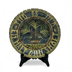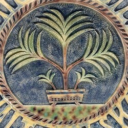 | Omschrijving | Een antiek Fries kerfsnee aardewerken bord met centraal voorstelling van een plant in jardiniere, en op de randen tekst ‘Tiid is jild en halt gjin skoft’ |