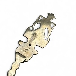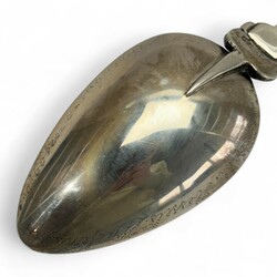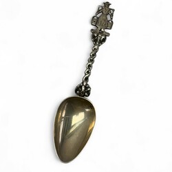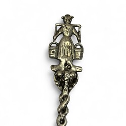 | Omschrijving | Een antieke tweede gehalte (835/1000) zilveren geboortelepel, getorste steel, bekroond met een boerin met juk en twee emmers. Aan de achterzijde met inscriptie ‘Elizabeth Hessels Wassenaar geboren 8 augustus 1902’. (Geboren te Hijlaard). Gekeurd met lopende leeuw, minervakopje, jaarletter Q (1900) en meesterteken ‘JS189’ = mr. Johannes Schijfsma, werkzaam te Woudsend en Sneek van 1848 tot 1902. |
