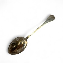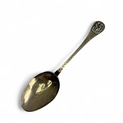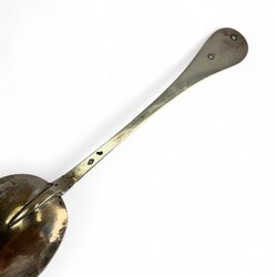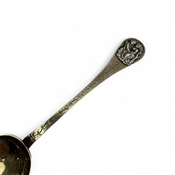 | Omschrijving | Een antieke vroeg 19e eeuwse tweede gehalte (835/1000) zilveren geboortelepel, met gegraveerde steel en bekroond met plaquette, met voorstelling van twee figuren. Aan de voorzijde gemerkt met minervakopje en lopende leeuw, aan de achterzijde met meesterteken ‘JB’ (mogelijk Johannes Bremer, Leeuwarden 1813-1829) en jaarletter T (1828). Tevens met inscriptie ‘TPD 1828’. |