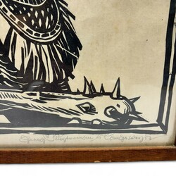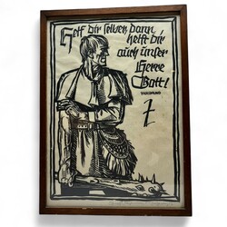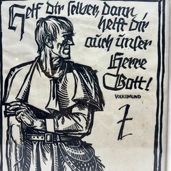 | Omschrijving | Linosnede op papier, voorstelling van een man met knuppel en Germaanse letters 'Helf dir selben, dann helft dir auch unser herre Gott! Volksmund', door Georg Sluyterman von Langeweyde (Essen 1903 - Bendestorf 1978). |