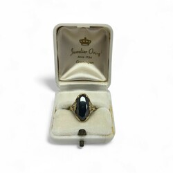 | Omschrijving | Een 20e eeuwse 14 karaats (585/1000) geelgouden damesring, centraal bezet met ovale hematiet. Gemerkt met eikenblaadje aan de achterzijde. |